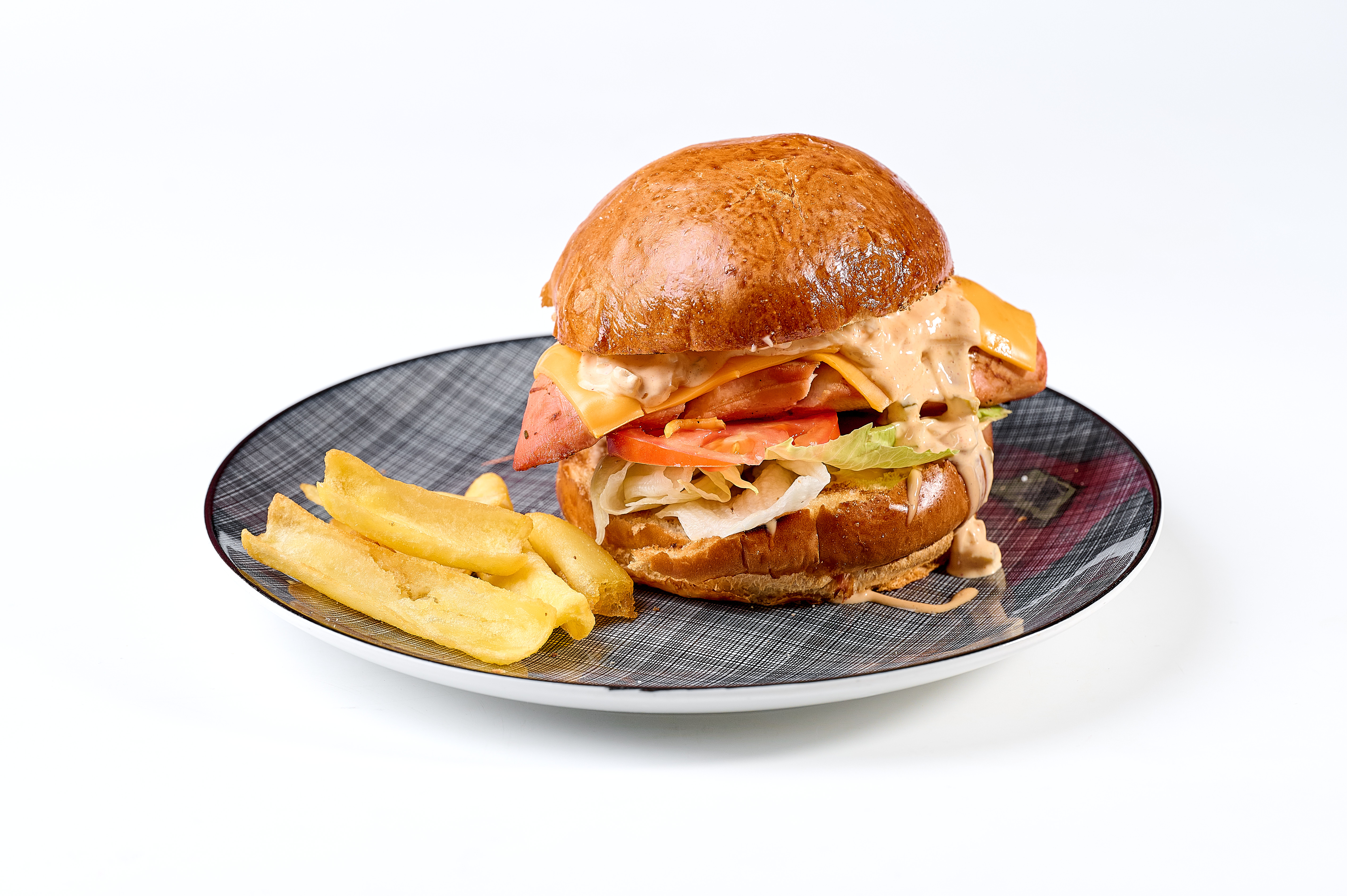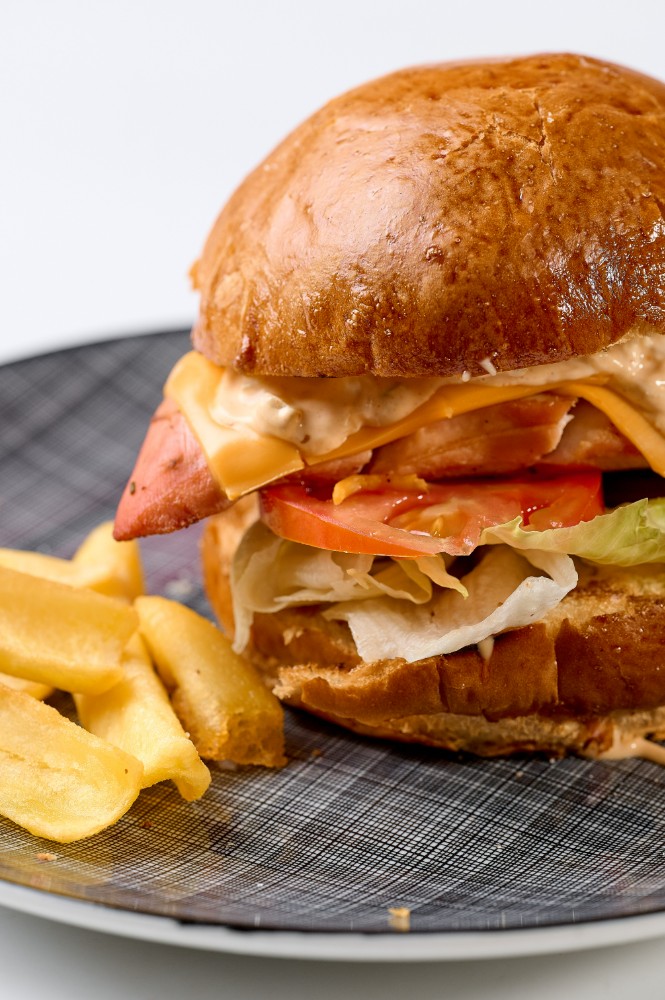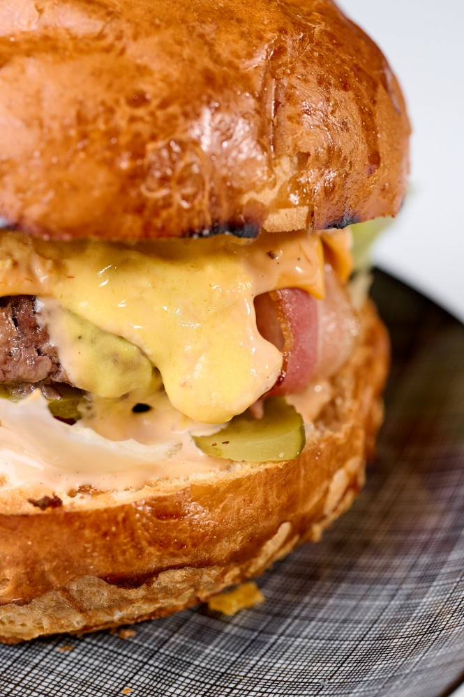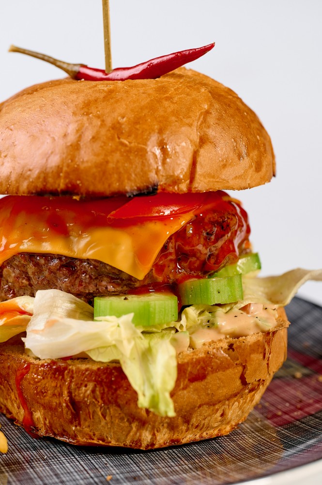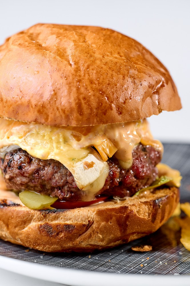 Яловича котлета обсмажена на мангалі, з додаванням трьох видів сиру(камамбер, дорблю, чеддер), томататами, листям салату, маринованим огірком та сирним соусом.300 г