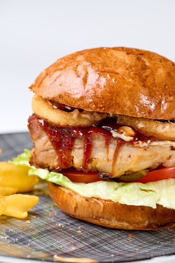 Томленне свинне ребро без кістки, запечене в соусі BBQ, з листям салату, томатами, маринованим огірком, цибулевими кільцями та авторським соусом від шефа.300 г