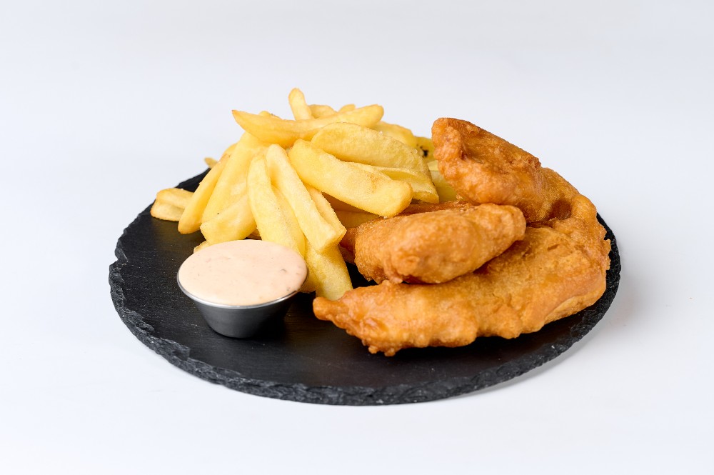 Філе хека смажений в клярі з картоплею фрі та соусом тартар.350 г