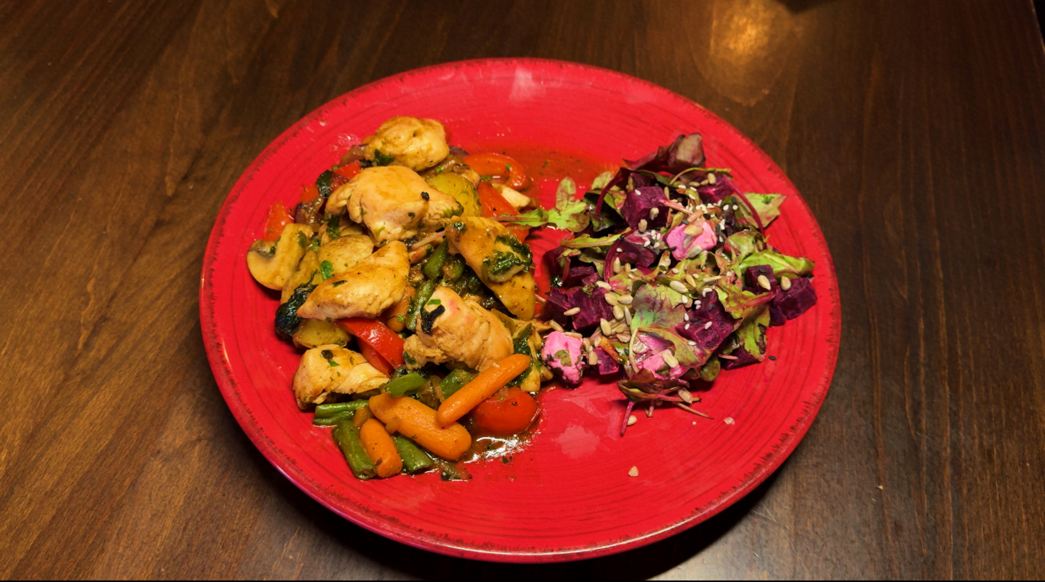 Овочеве рагу з соковитою куркою та легким салатом з буряком на зеленій подушці