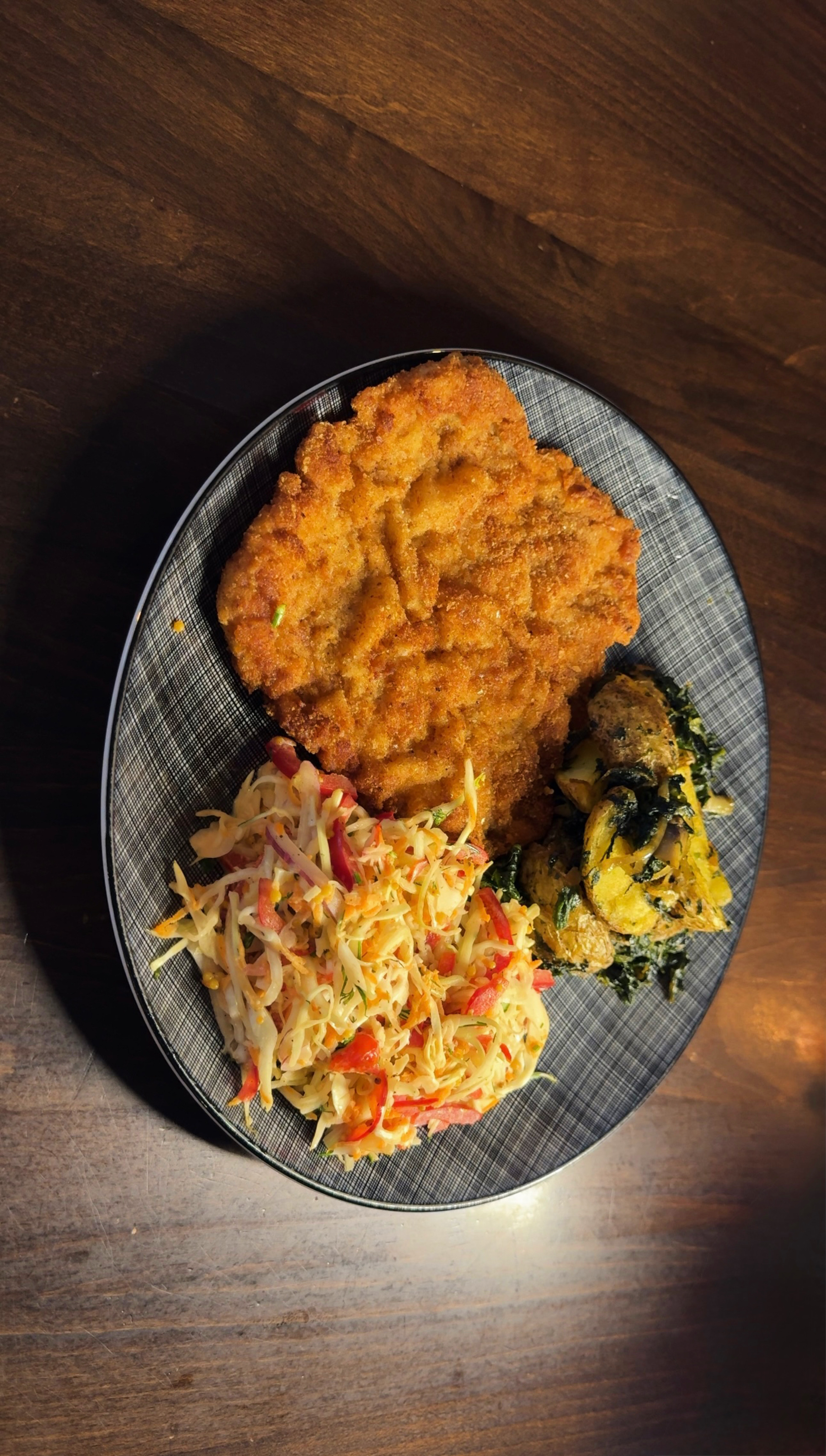 Свинний шніцель з запеченою картоплею в шпинаті та салатом Коул слоу