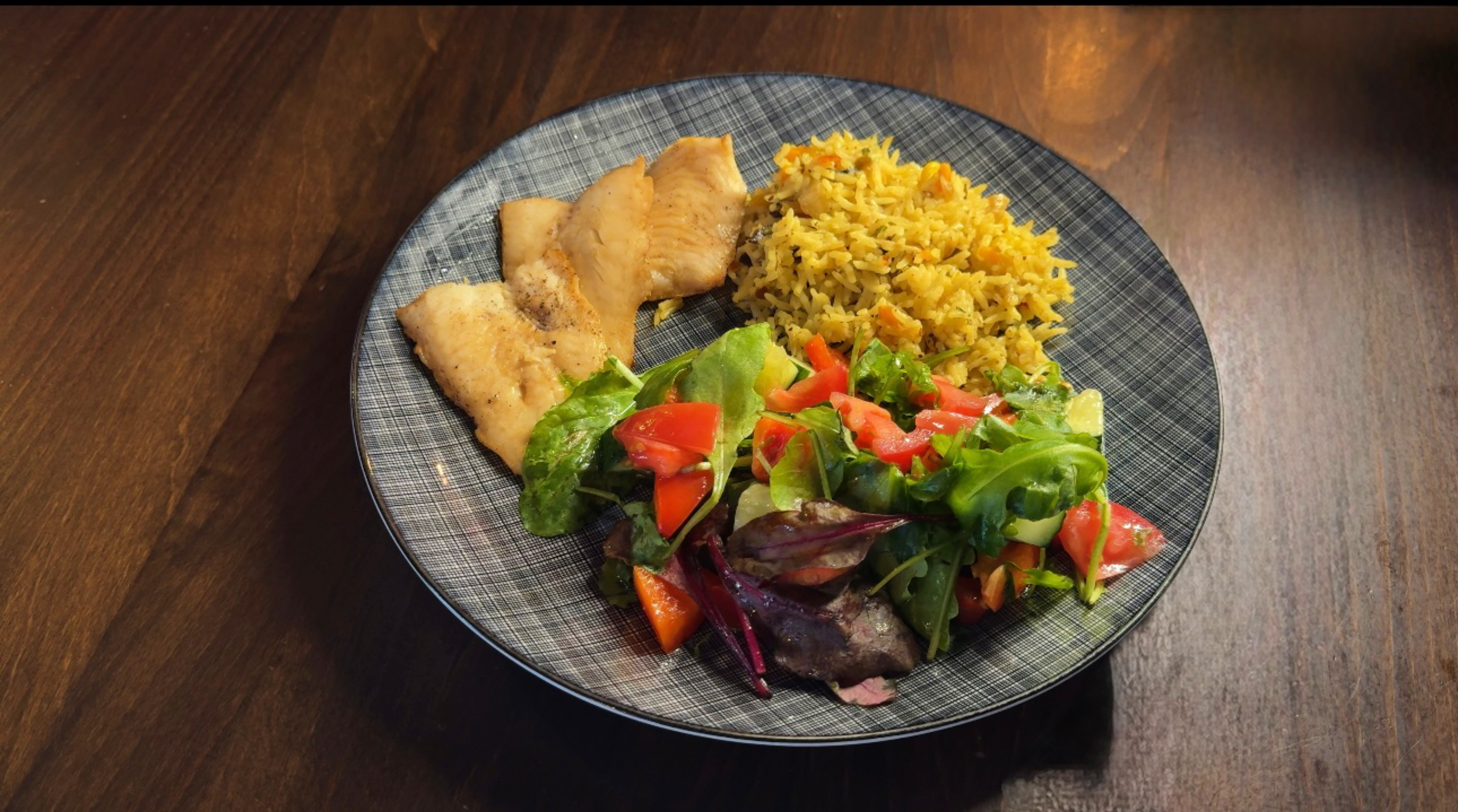 Запечений хек з рисом з овочами та овочевим салатом