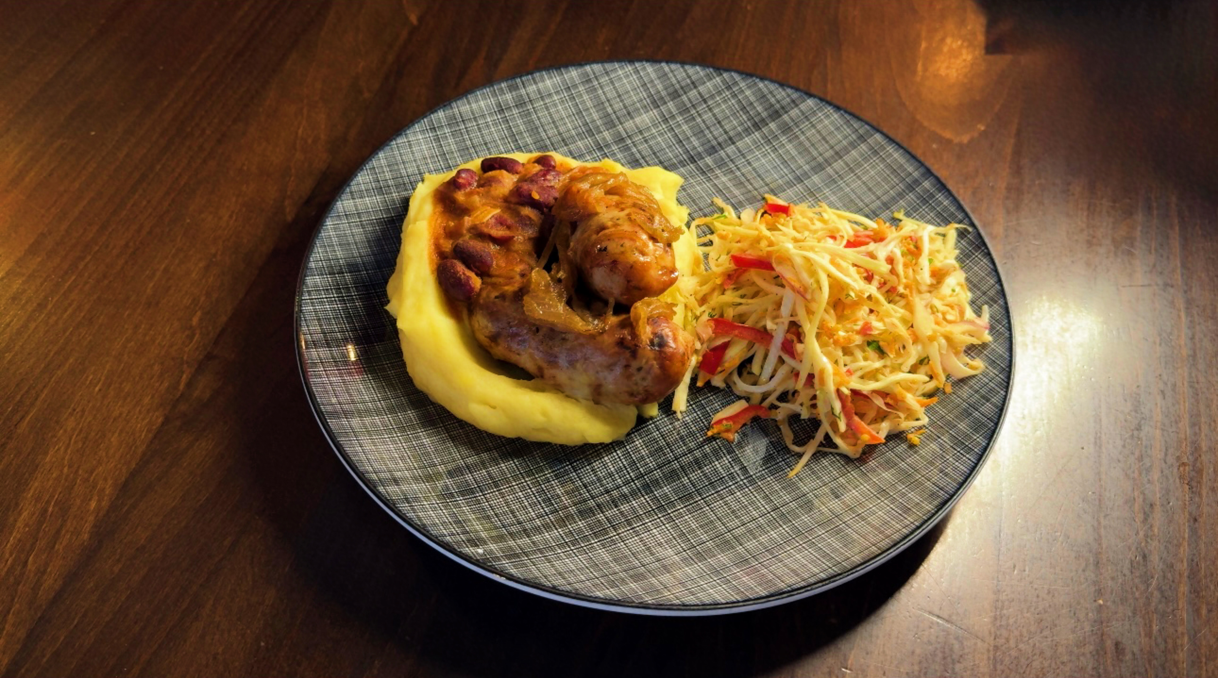 Ковбаски з картопляним пюре, фасолею в томаті та салатом Коул слоу